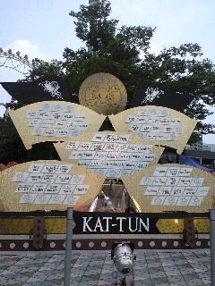 8月1日(金)予定より20分遅れて羽田に到着。 ビックリしましたぁ〜 暑いです。 ミストサウナに入っているような気分でした。 大丈夫かな。。。2泊3日(笑) ホテルの部屋に入ったのは、日付が変わる少し前^^; お部屋からライトに浮かびあがる「TOKYO DOME」の文字がくっきりと見えて綺麗でした。 ![]() それから、同じホテルの方々とDVD鑑賞会〜♪ 気が付けは外が明るくなりかけてました(;^-^A 朝起きて、窓の外をみるとグッズ売り場に人影が。。。。。 ![]() アッという間に長蛇の列になってました。 ビックリ!ビックリ! だって、まだ発売2時間前ですよ。 この暑さの中、2時間待ちはキツイ!と朝グッズを買うのは諦めかけました。 朝ゴハンをゆっくり食べて、もう一度グッズ売り場を覗くと、更に長蛇の列^^; まっ!最悪、明日もあるしねって事で、出かけるまではまだ時間があるので、またまたDVDを見ながら マッタリ〜 そうしているウチにグッズ売り場は予定より30分以上前にオープンしたようで、少しづつ列が短くなってきました。 かなり列が短くなってきたのを見計らって、グッズを購入! 地域限定のピンバッチは暑さに弱い私には罪ですわぁ。 会場の前にあるオブジェや看板です。 ![]() グッズも購入して、次はクリスピードーナツ屋さんへ ここは去年のドリボで遠征したときに、凄く混んでいて食べることが出来なかったところで、リベンジです。 ![]() 朝早かったせいか、すんなり買えました〜 待っている間に配られるドーナツの美味しかったこと!! 売れるわけです(笑) ライブの前にオフ会♪ 今回はまったく初めましての方もいらっしゃるので、初名刺作成しました!! 皆さんからも、いろいろ名刺を頂いたのですが、これがなかなか面白い 面白いというか、印刷してある写真がそれぞれ好みがあって、 この方はこういうのがお好みなのね〜って思いながら見るのが楽しいですね。 で、いよいよ初東京ドームです。 とにかく、遠くが良く見える度数のコンタクトを装着!! 乾きにくいって評判のやつね! 座席はアリーナAブロックセンター花道横 メインステージは肉眼でとーっても良く見えますが、花道の反対側のステージやバックステージは、殆ど見えません。 これは仕方ないですね。 とにかくドームのコンサートに参加するのが久しぶりなものですから、広くて広くて。。。。 〜T∀BOO〜 きゃあ〜、でたぁ〜 仁くんは座ってパイプの煙をモクモク〜 始まったばかりなのに、倒れそう(笑) 何でしょう、やっぱり5万5千人の歓声って凄いですね。 始まったぁ〜という感じで、凄く感動しました。 サングラスがねぇ、これまたたまらんです。。。はい^^; 中丸さんは黒ブチの眼鏡姿。 珍しいですね。 もう、サングラスはずしてカメラ目線された日には、本日始まって間もないのに、またまた倒れそうでした。 こっき君「お前ら、声出さないと命はないからなぁ!!」 ああ、KAT-TUNのコンサートに来たんだなぁとシミジミ 〜DON'T U EVER STOP〜 もう、ダンスが素晴らしくて、素晴らしくて、クギ付けでございます。 仁ちゃんの腰グイングイン〜 ああ、KAT-TUNのコンサートに来たんだなぁと、またまたシミジミ(笑) 亀ちゃんのソロのオフショット写真は、中丸さんがケイタリングの食事を選んでいるもの。 こっき君と田口君が半裸で密着しているもの もちろん会場は「きゃあ〜」 この写真に仁くんは登場したことあるのかしら。。。。 TEN-Gはやっぱり可愛い 亀ちゃんが鼻を折られた状態で登場 あんまり長々せずにサラッと歌に行った印象がありますが、マイクの横笛を吹く仁ちゃんの可愛さにクギ付けでよく覚えてません^^; MCは・・・ いつもの、告知モロモロ アルバムが1位というところで、こっき君、仁くん、上田さんで長々と頭を下げる。 中丸さんが「いいとも」風に拍手を仕切る(笑) 仁くんは途中で足元に何か落ちていたのか、足でサッサッと何度も払っていました。 何が落ちていたのかは見えず。。。。 で、ドームの上の方の階段が凄く急になっていると亀ちゃん。 最上階の方に向って「俺たち豆粒でしょ?見える?」(的なことを言ってました) ここで仁くんが「上の方もちゃんと見えてます」と。。。 そこの付けまつ毛の人とか言ってたような。。。 あと色々な方が来てくれている。 「外国の方、男性、老けた顔の方、若作りの方。。。」( ̄□ ̄;) 何つー事を。。。。 思わず顔隠しましたよ。 MCの最後にキスマイとABCから大事なお知らせということで、全員がずらっとステージに並ぶのですが、お約束で仁くんとこっき君もしっかりと一緒に並んでます。 中丸さんが気付いて、首を掴んで連れ戻してくれるかなぁと思って見ていましたが、最後まで2人はエビキスに混じったまま^^; お辞儀をしてハイタッチまでしてました(笑) お知らせは10月に横アリで単独ライブをするというもの。 みんなとーっても嬉しそうな顔をしていました。 五関君晴れ晴れとした表情だったなぁ。 おめでと〜、おめでと〜という気持を込めて拍手しました